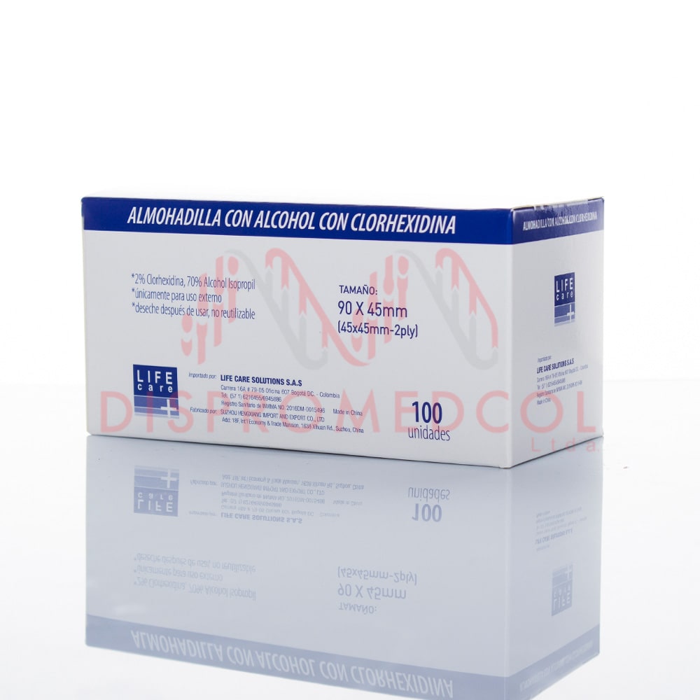 Compuesto por: algodón no tejido y saturado con alcohol isopropílico con densidad del 70% como desinfectante y clorhexidina al 2%.