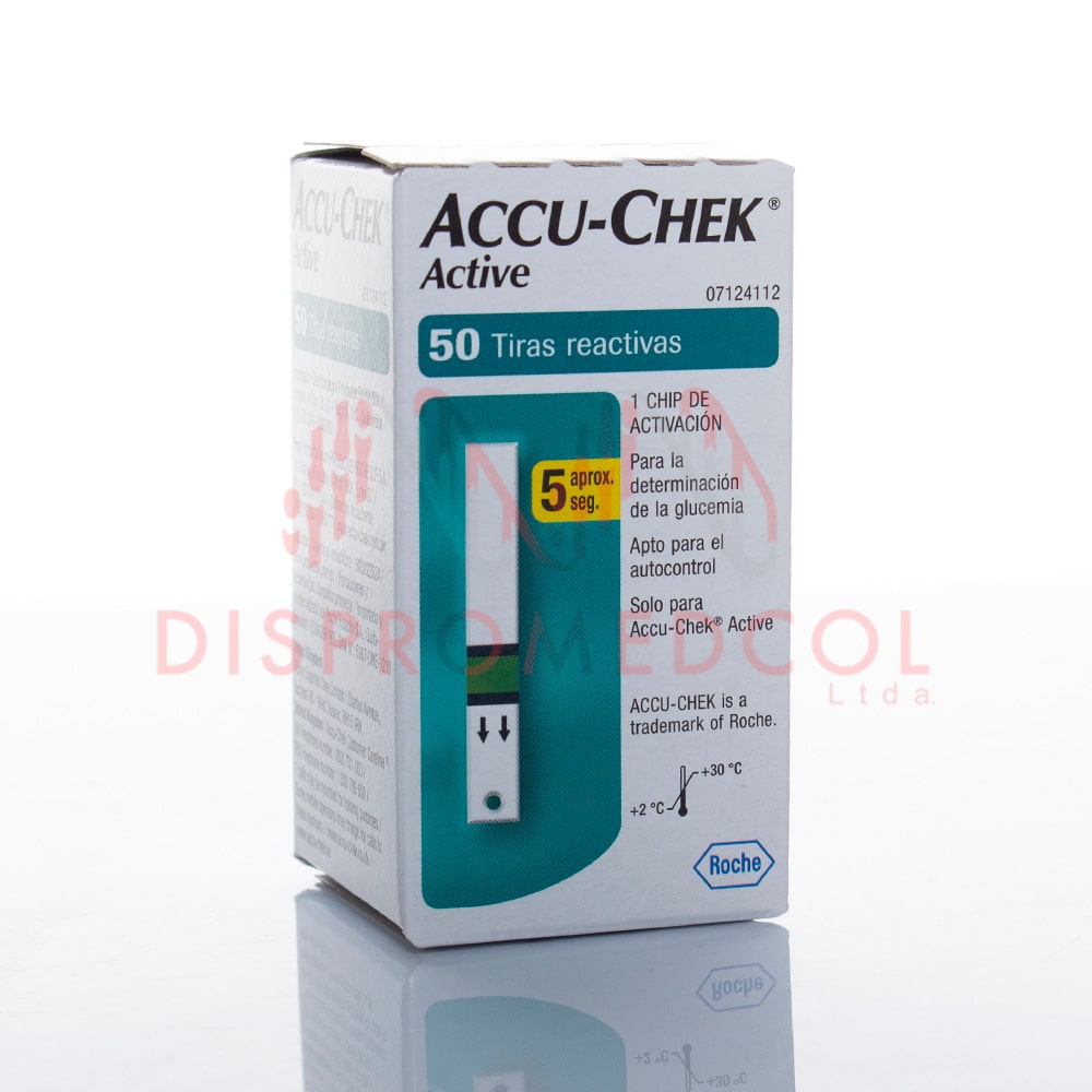 Las tiras reactivas Accu-Chek Active cuentan con comprobación visual de niveles y estado de las tiras a través de bloques de color en la etiqueta. La zona de dosificación tiene una malla protectora verde.